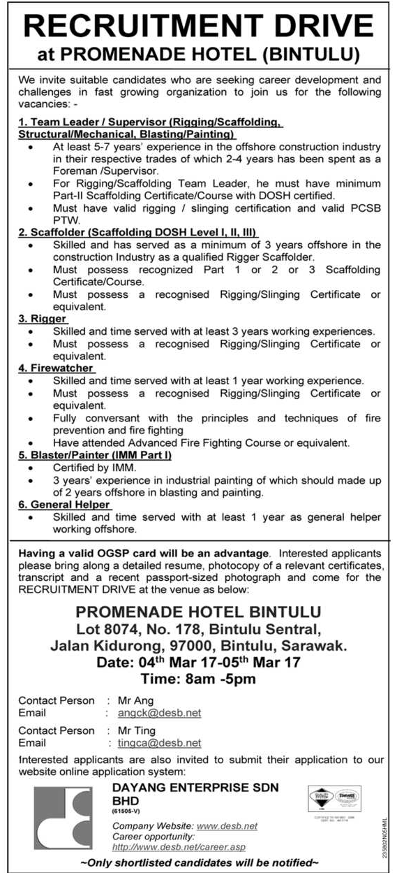 Dayang Enterprise Recruitment For Painter Supervisor Electrician Kuching