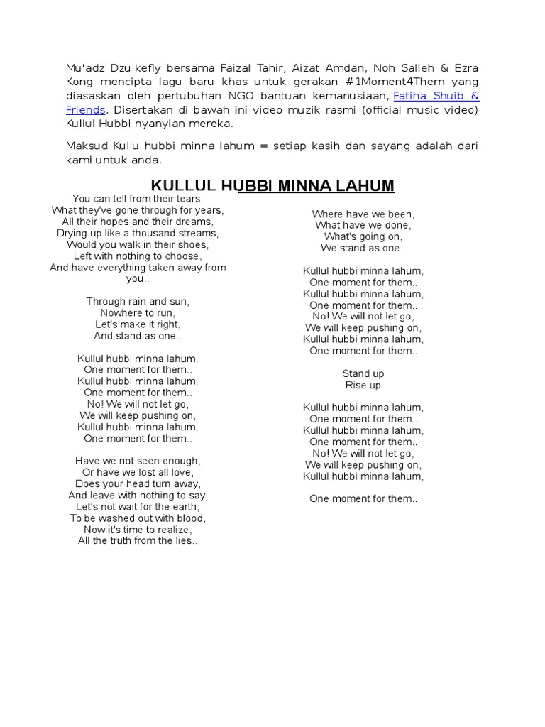 Lirik lagu faizal tahir kullul hubbi ft mu adz dzulkefly noh salleh aizat amdan you can tell from their tears what they ve gone through for years all their hopes and their dreams drying up like a thousand streams would you walk in their shoes left with nothing to choose and have everything taken away from yo.