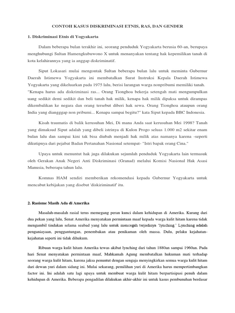 Contoh Kasus Diskriminasi Etnis Ras Dan Gender 1 Diskriminasi Etnis Di Yogyakarta