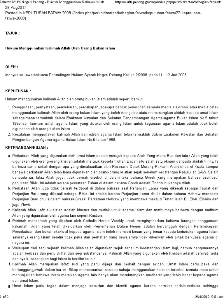 Hukum Menggunakan Kalimah Allah Oleh Orang Bukan Islam Jabatan Mufti Pahang 2008