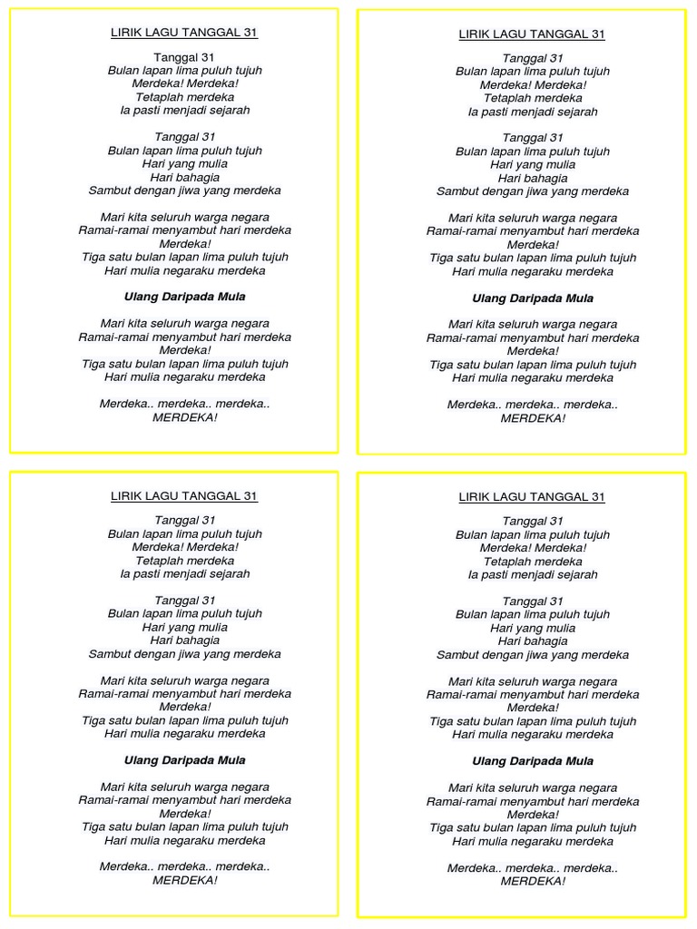 Lirik Lagu Tanggal 31 Docx Lirik Lagu Tanggal 31 Tanggal 31 Bulan Lapan Lima Puluh Tujuh Merdeka Merdeka Tetaplah Merdeka Ia Pasti Menjadi Sejarah Course Hero