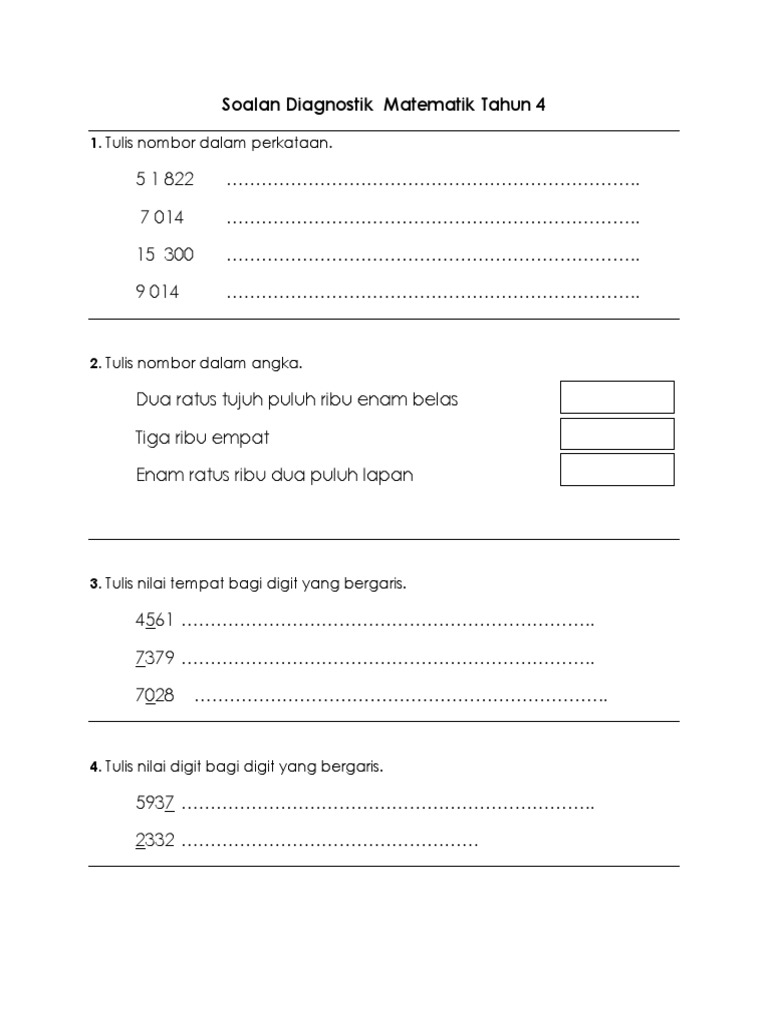 Soalan Diagnostik Matematik Tahun 4 Tulis Nombor Dalam Perkataan